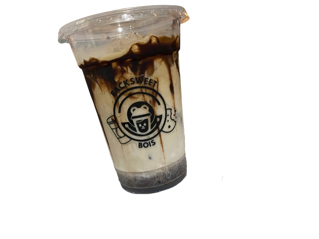 This cold coffee beverage is a rich and creamy drink that has a strong coffee flavor balanced by the sweetness of the dark chocolate syrup. White from the bottom because of the milk and drip of dark brown color due to the espresso and chocolate syrup.