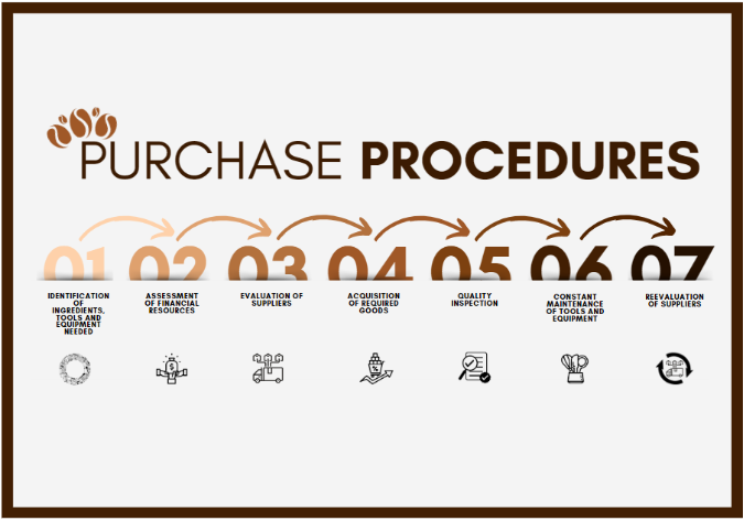 For the purchase procedures of the BackSweet Bois, assessment of inventories will take place first and then, the production manager provides a comprehensive list of ingredients, tools and equipment used both for coffee and cookies. Afterwards, the financial manager assesses the business' financial capabilities, checking whether its resources are high enough to pay the cost of acquiring the ingredients, tools and equipment necessary to produce the offered products. Furthermore, once the Financial manager gives a go-sign, choosing of appropriate suppliers from the previously chosen stores commences, eliminating the alternatives and below the average.