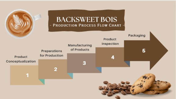 The flow chart depicts the general process that the BackSweet Bois will undergo to produce the intended consumable goods that will be offered to the customers. This flowchart consists of 6 general steps namely: Production Conceptualization, Preparations for Production, Manufacturing of Products (Coffee and Cookies), Product Inspection, and Packaging.