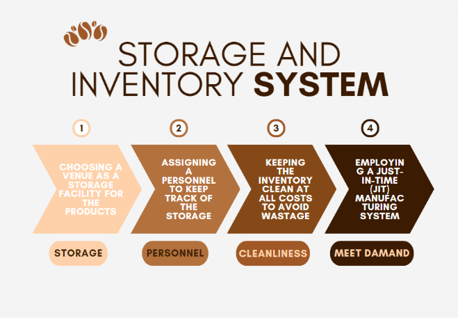 In any business, having safe storage and capable personnel to oversee the inventory is a pivotal step towards an efficient and effective business operation. This results in a good maintenance of equipment and tools, as well as excellent condition of the ingredients, with no excess or deficit. However, no rent expenses will be incurred for inventory storage as this business is a new one and still underdevelopment. Instead, the business owners opted to utilize two houses of different members, one for the production of coffee and one for the production of cookies, as storage facilities for raw materials, pre-baked, packaged cookies and brewing ingredients.